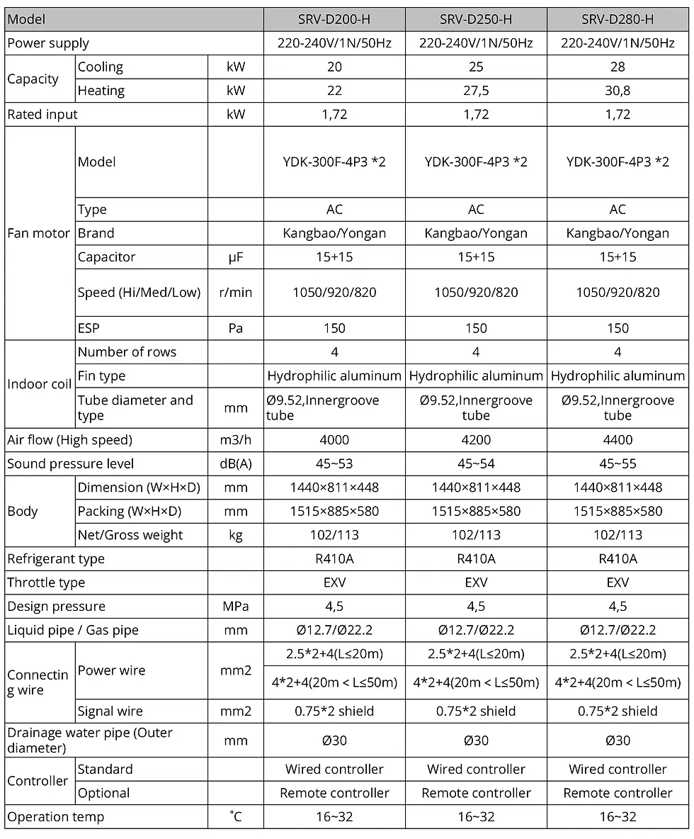VRF Indoor High ESP Ducted type with cooling capacities ranging from 20 kW to 28 kW and heating capacities from 22 kW to 30.8 kW, these units operate on a 220-240V/1N/50Hz power supply. Equipped with Kangbao/Yongan fan motors and hydrophilic aluminum coils, they ensure efficient performance and durability. With dimensions 1440×811×448mm and airflows reaching up to 4000~4400 m3/h, these units provide powerful and reliable climate control solutions for various spaces.