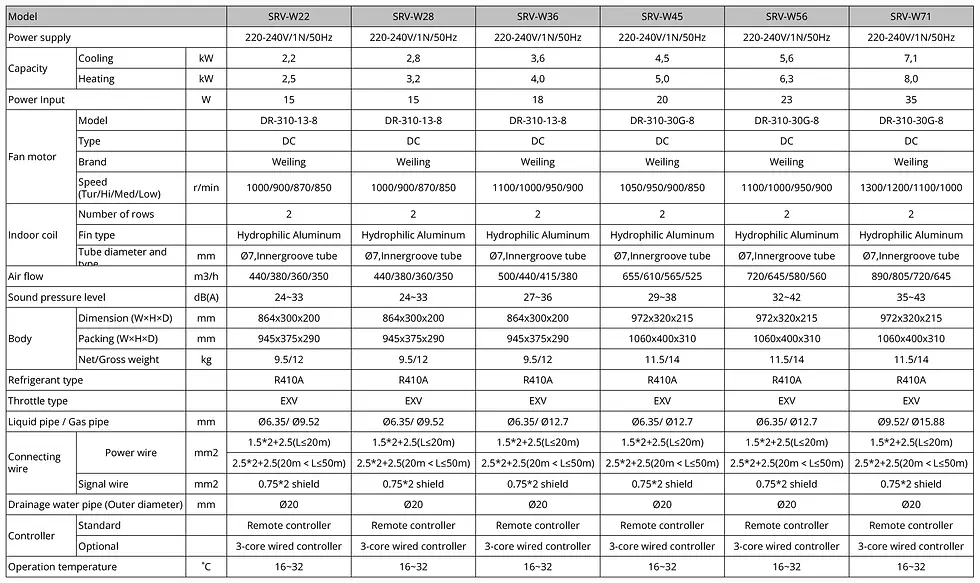 Wall-mounted (DC) with variations in capacity, power supply, fan motor, indoor coil, body dimensions, and other features. Each model has different cooling and heating capacities, fan motor specifications, coil dimensions, etc. They all operate on a 220-240V/1N/50Hz power supply and use R410A refrigerant. The models range from SRV-W22 to SRV-W71.
